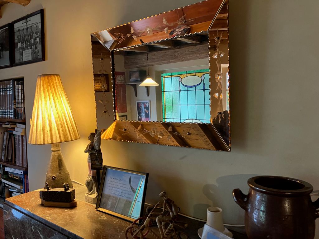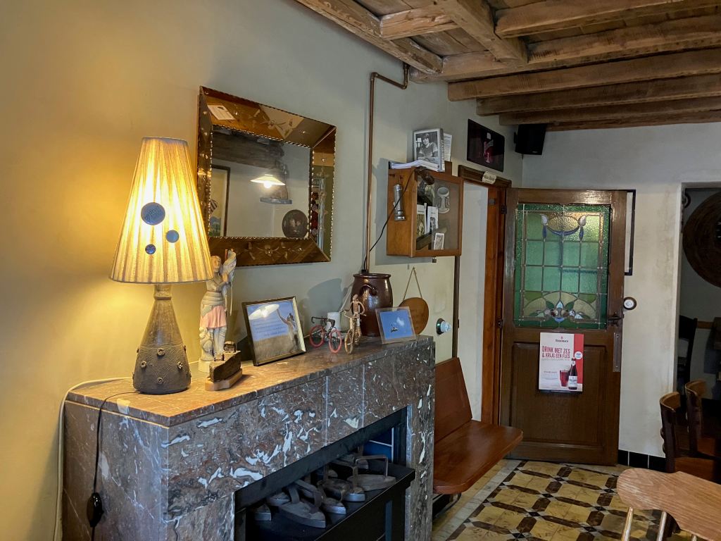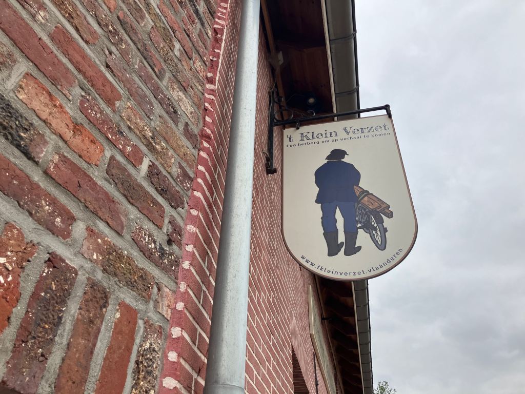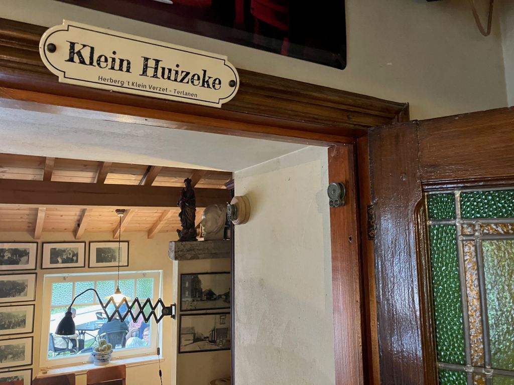 Une nouvelle marche avec Anne, dans la réserve naturelle très vallonnée du Sint-Agatha Rodebos de Terlanen, nous fit atterrir en fin de parcours dans un splendide estaminet du village de Terlanen : ‘t Klein Verzet (plusieurs traductions possibles, notamment « La petite résistance » ou « La petite vitesse »). Le Verzet fêtait précisément son dixième anniversaire ce 15 août 2025. Les propriétaires, Ingrid et Dirk, avaient acheté un vieille ferme du village et reconstitué en 2015 un bistrot dans le style des années trente. Un lieu lumineux et paisible, un peu hors du temps, où se raconter des histoires après une marche en buvant une de leurs bières ou de leur vins. De nombreuses informations sur « l’auberge » (le café se nomme « herberg », notamment parce qu’il y a moyen de passer une nuit au grenier et que le terme a une connotation chaleureuse), ses boissons (très détaillées), la région et ses promenades, des éléments d’histoire locale et des prises de position écologiques et politiques concernant l’Europe des régions, sur leur très beau site Internet.