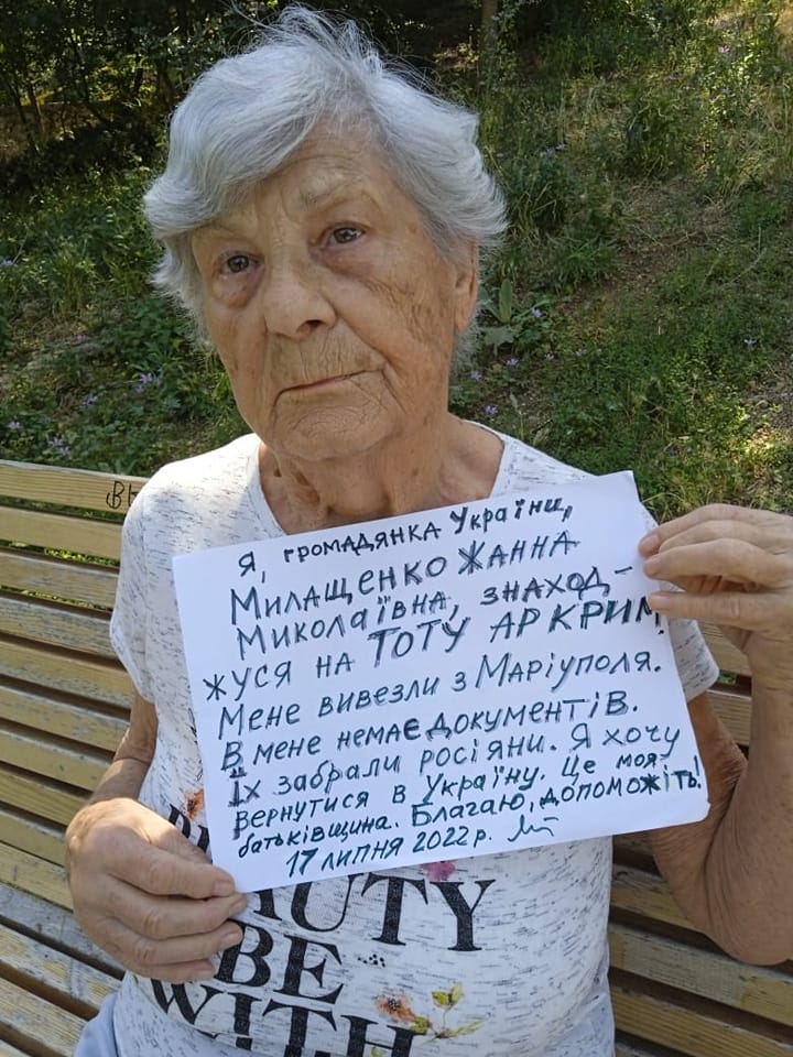 Femme de Marioupol déportée en Crimée. Le texte dit : « I, a citizen of Ukraine, Zhanna Mykolaivna Milashchenko, am in the temporarily occupied territory of Ukraine, Crimea. I was taken out of Mariupol. I have no documents. The Russians took them. I want to return to Ukraine. This is my homeland. Please help! July 17, 2022 ». Image envoyée par Igor Zhuk de Kyiv, qui a fait la traduction.