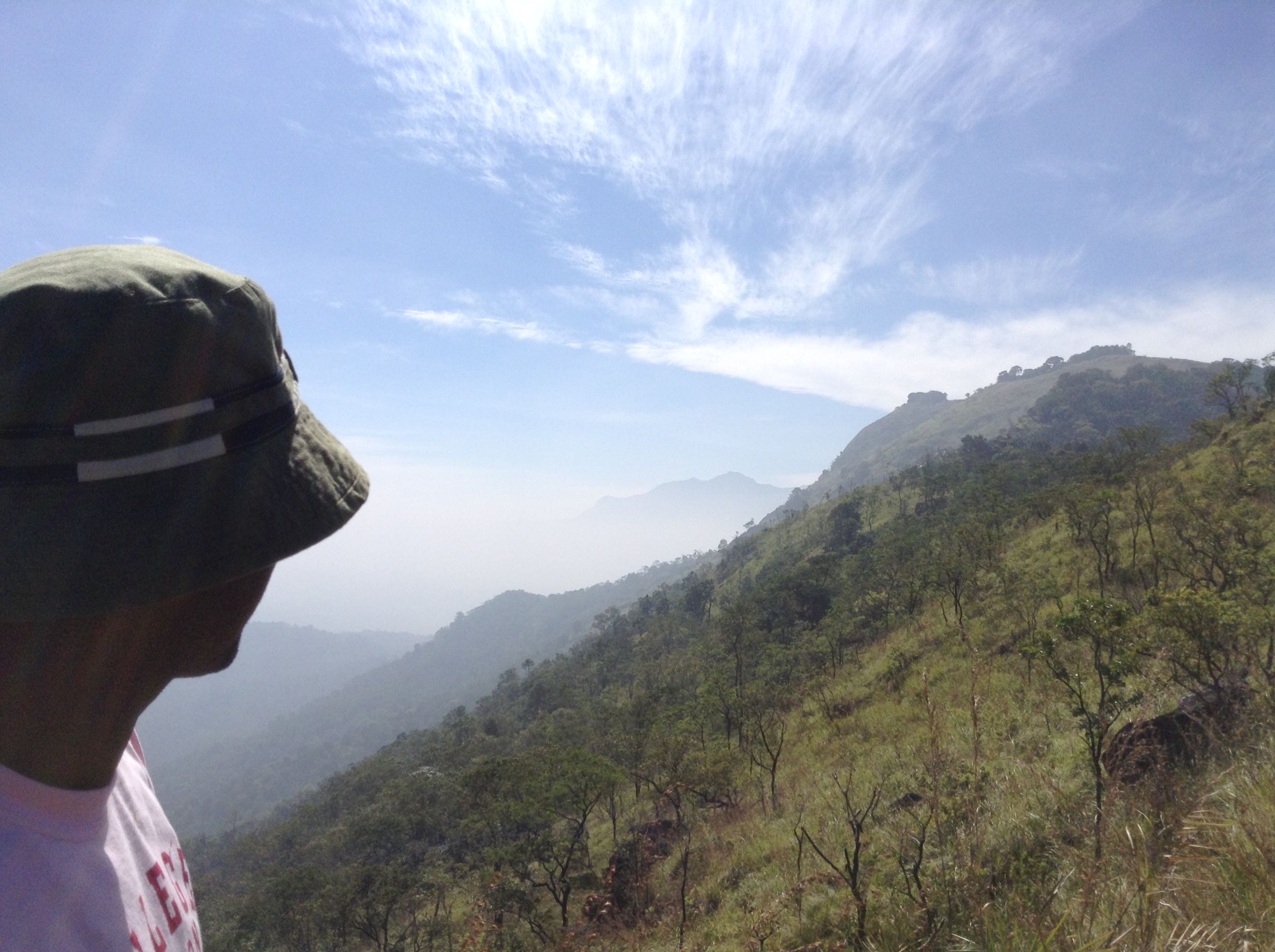 Lorsqu’un des maillons humains s’arrête et contemple le vide, face à la falaise et à son escalier, il peut apercevoir un paysage montagneux de cultures et de forêts tropicales – qui s’étend vers le Karnataka ou le Tamil Nadu – d’où émergent des pains de sucre sertis par les arbres. Cocotiers aux palmes dentelées comme des peignes, bananiers tendres et volontaires, manguiers touffus, lianes de poivriers frangées de grappes, caféiers en sous-bois, nappes de théiers piquetés d’arbres pour fixer les sols, plants de cardamone en éventail, arbustes de tapioca semblables à des trèfles géants, jaquiers aux appendices testiculaires énormes, rangées d’hévéas striés de veines blanches, bambous géants… De temps à autre, au creux des cuvettes, des champs de riz se découpent en damiers, avec leurs bœufs flanqués d’oiseaux blancs. Le microcosme surélevé du Wayanad[1] que l’on atteint par une route en épingles à cheveux venant de Calicut – bordée de panneaux publicitaires géants et de parapets où gambadent d’impassibles macaques surgis de la forêt – se situe aux environs de mille mètres d’altitude, entourés de sommets qui le surplombent de la même hauteur. La caverne, attirant la chaîne de fourmis humaines comme du miel, abrite les reliquats d’une présence archaïque sur ce plateau luxuriant, longtemps isolé de la côte de Malabar par la jungle.