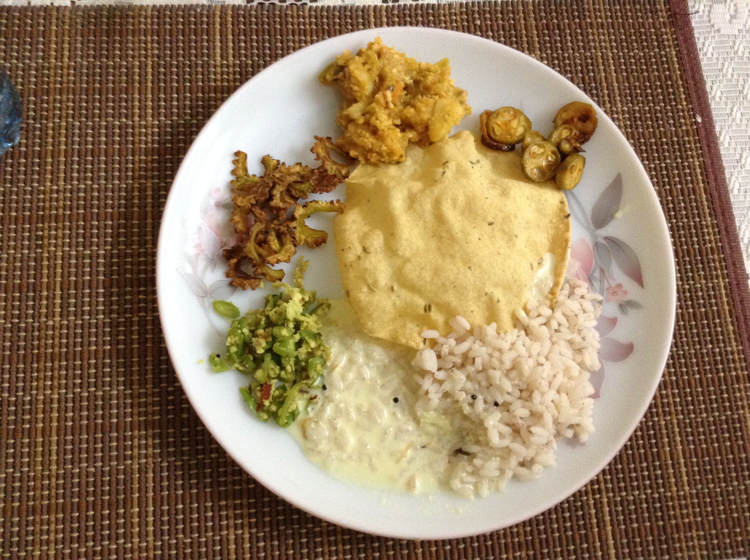 Cela n’empêche pas la plupart des villageois d’être invités aux banquets de mariage – chrétiens, hindous ou musulmans – servis sous de grandes tentes derrières lesquelles s’affairent des cuisiniers, accroupis devant des feux de bois et préparant le repas pour plusieurs centaines de personnes. Assis au milieu de la foule et des œillades complices, nous dévorons à pleine main (seulement la droite) la cuisine locale, servie sur feuilles de bananiers : riz blanc comme neige, currys de légumes, lentilles au ghee, pickles de mangues, roti croustillantes, roulades à la noix de coco, piments et petite banane…