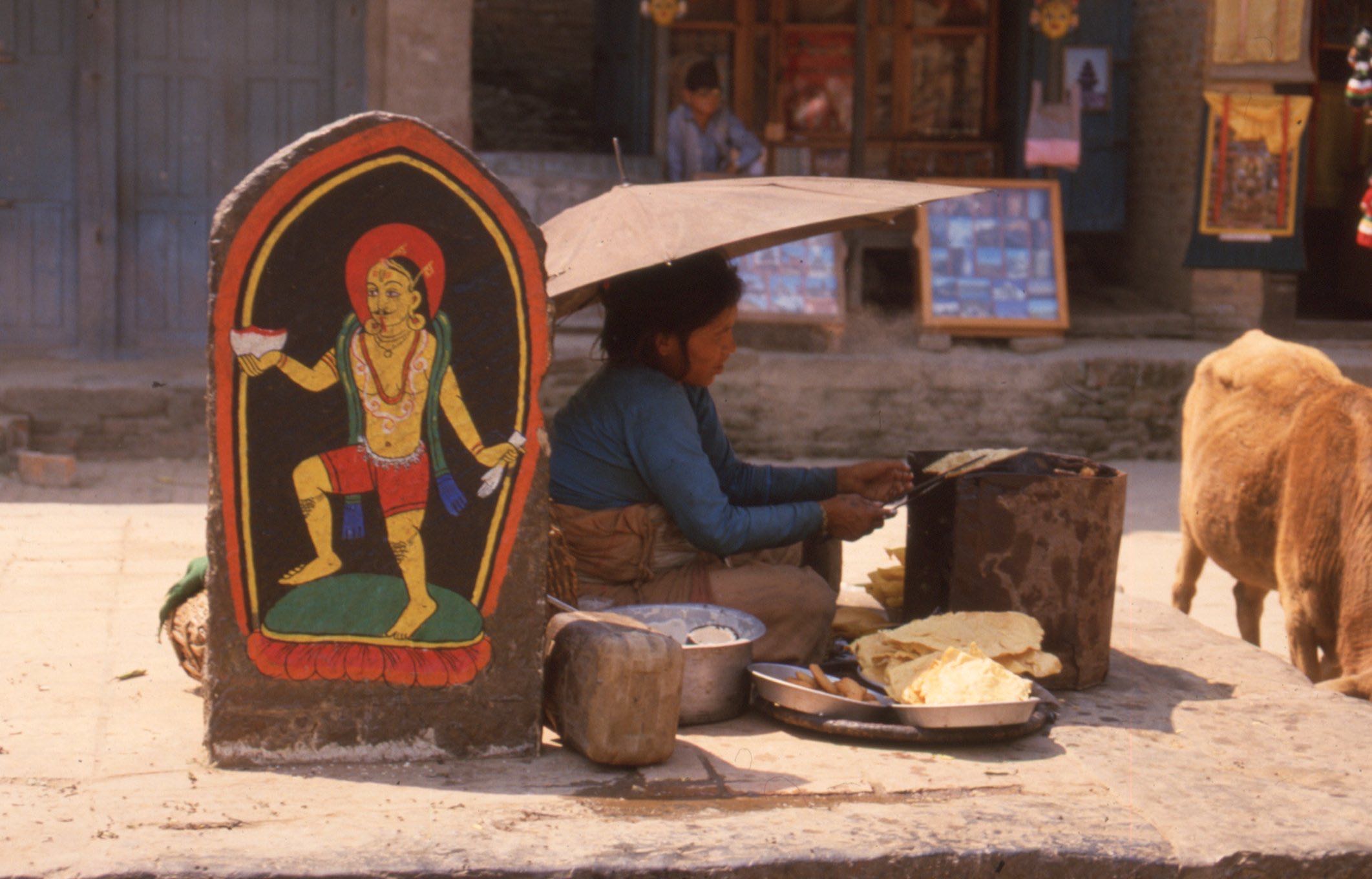 Un des premiers moments intenses de ce voyage fut l’immersion solitaire dans Katmandou la nuit tombée, après notre arrivée du Bangladesh, mon frère se reposant à l’hôtel. Pour la première fois de ma vie, je me plongeais dans l’atmosphère étrange, enfumée, bruyante, odorante et colorée d’une ville himalayenne encore moyenâgeuse à l’époque, grouillante de monde, d’échoppes, de temples en bois, de statuettes sacrées maculées de poudre rouge et orange. C’était hypnotisant ; je marchai des heures, ébloui, jusqu’au sommeil. Le lendemain, je contemplais longuement le passage d’une nuée de roussettes géantes, survolant la ville au coucher du soleil pour aller nicher tête en bas près du temple de Swayambunath.