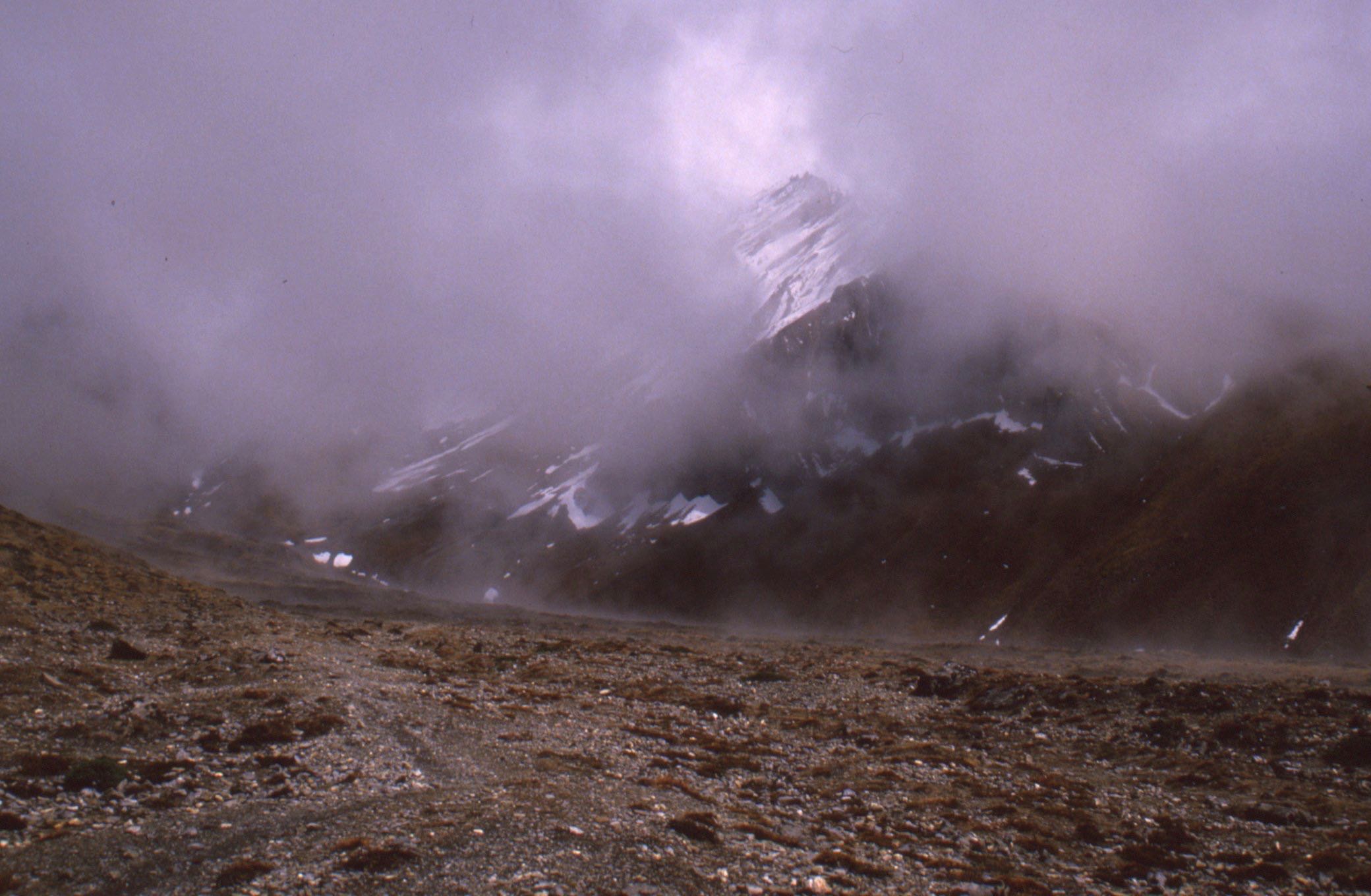 La neige commençait à couvrir le sol et à tomber de plus en plus drue des nuages épais et tourbillonnants ; on semblait s’enfoncer au cœur d’une tempête dans cet univers aveuglant de blancheur et de silence, de plus en plus froid. Le Yeti n’était pas loin ; sa grosse tête oblongue devrait surgir d’un instant à l’autre d’une grotte ou d’une crevasse. Je marchais en tête, curieusement remis, en une journée, de mon mal des montages. Mon compagnon suivait à une centaine de mètres, marchant bien droit, mais il fit soudainement volte-face pour redescendre, sans lancer le moindre appel. Il ne semblait pas avoir de malaise, n’avait pas souffert du mal. J’étais perplexe, le hélais avec force, lui fis de grands signes, mais il continuait de descendre sans répondre. La bourrasque était telle qu’il avait peut-être pris peur, ne m’entendait et ne me voyait pas. Cela, aussi, ressemblait à Tintin au Tibet. Comme il n’était pas en danger, je décidais de continuer et de l’attendre après le col, car une marche arrière risquait de rendre le Tour impossible. La montée fut interminable, chaque bosse en cachant une suivante, jusqu’aux chevaux de vent qui marquaient le Thorong La. J’étais passé et il n’y avait plus qu’à descendre à toute vitesse pour atteindre le premier village avant la nuit.