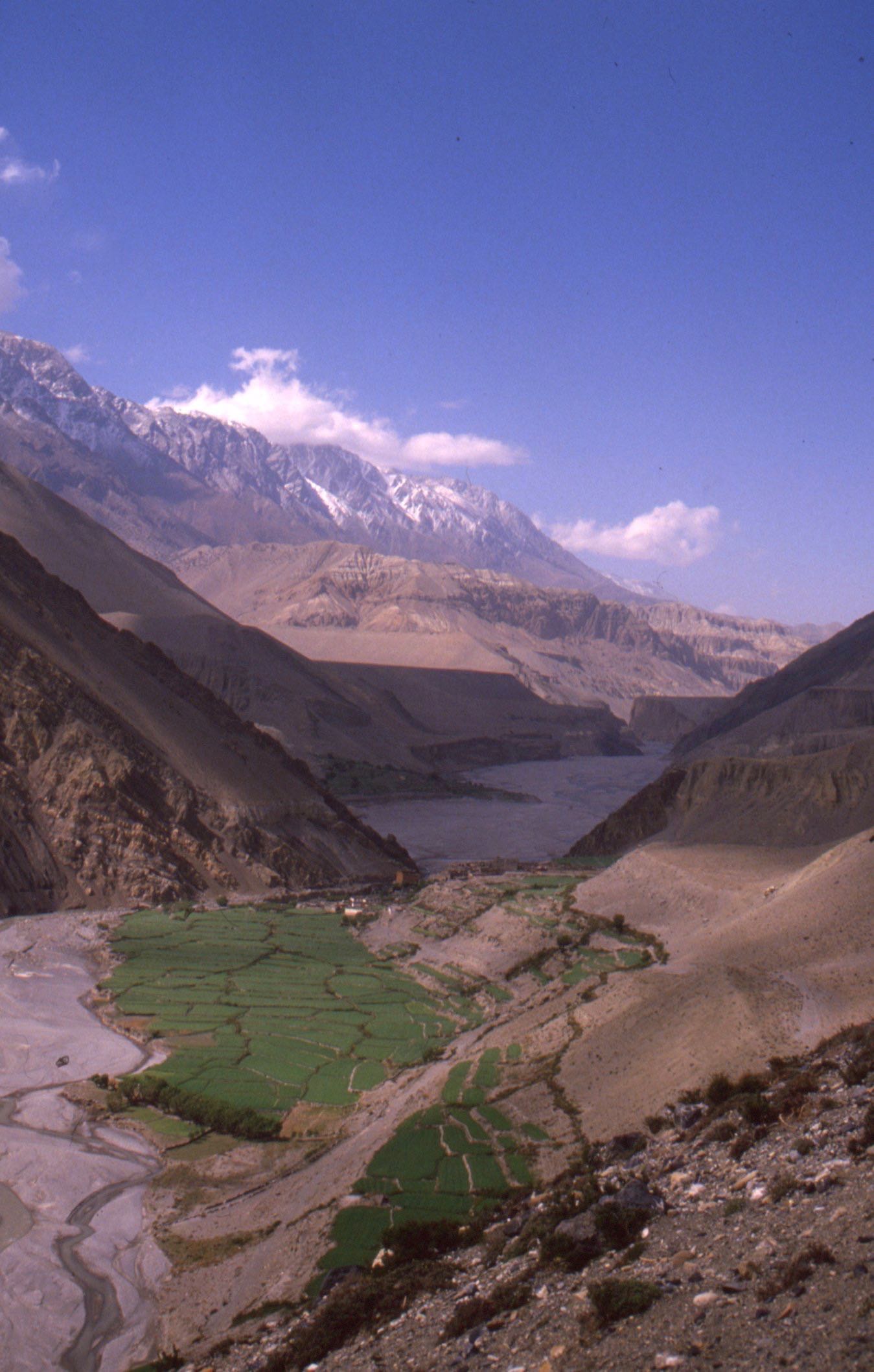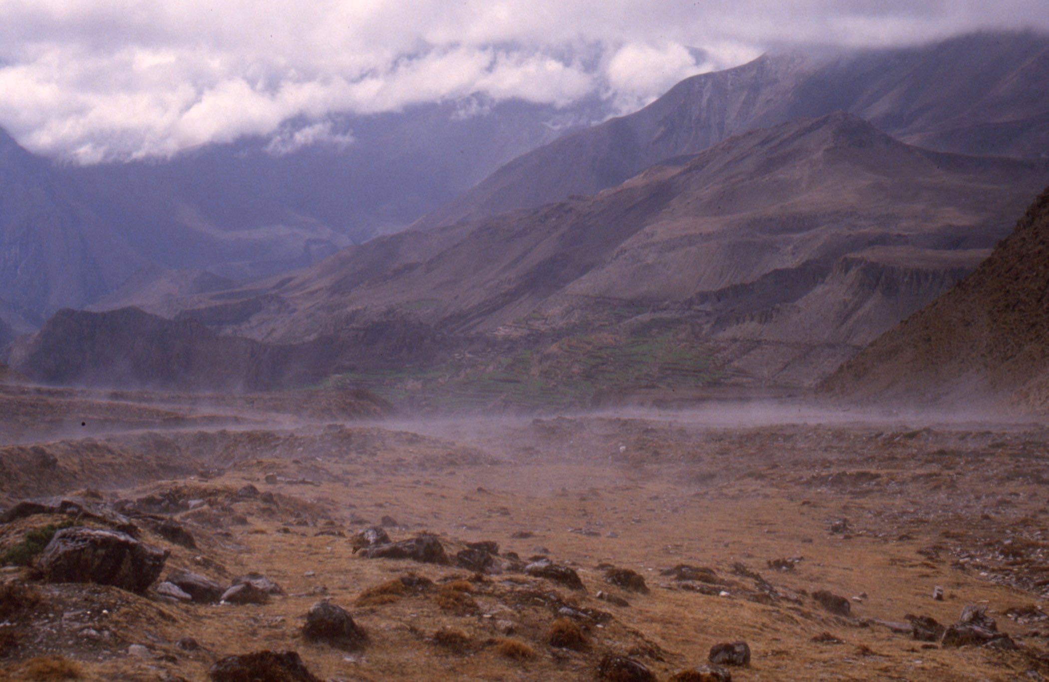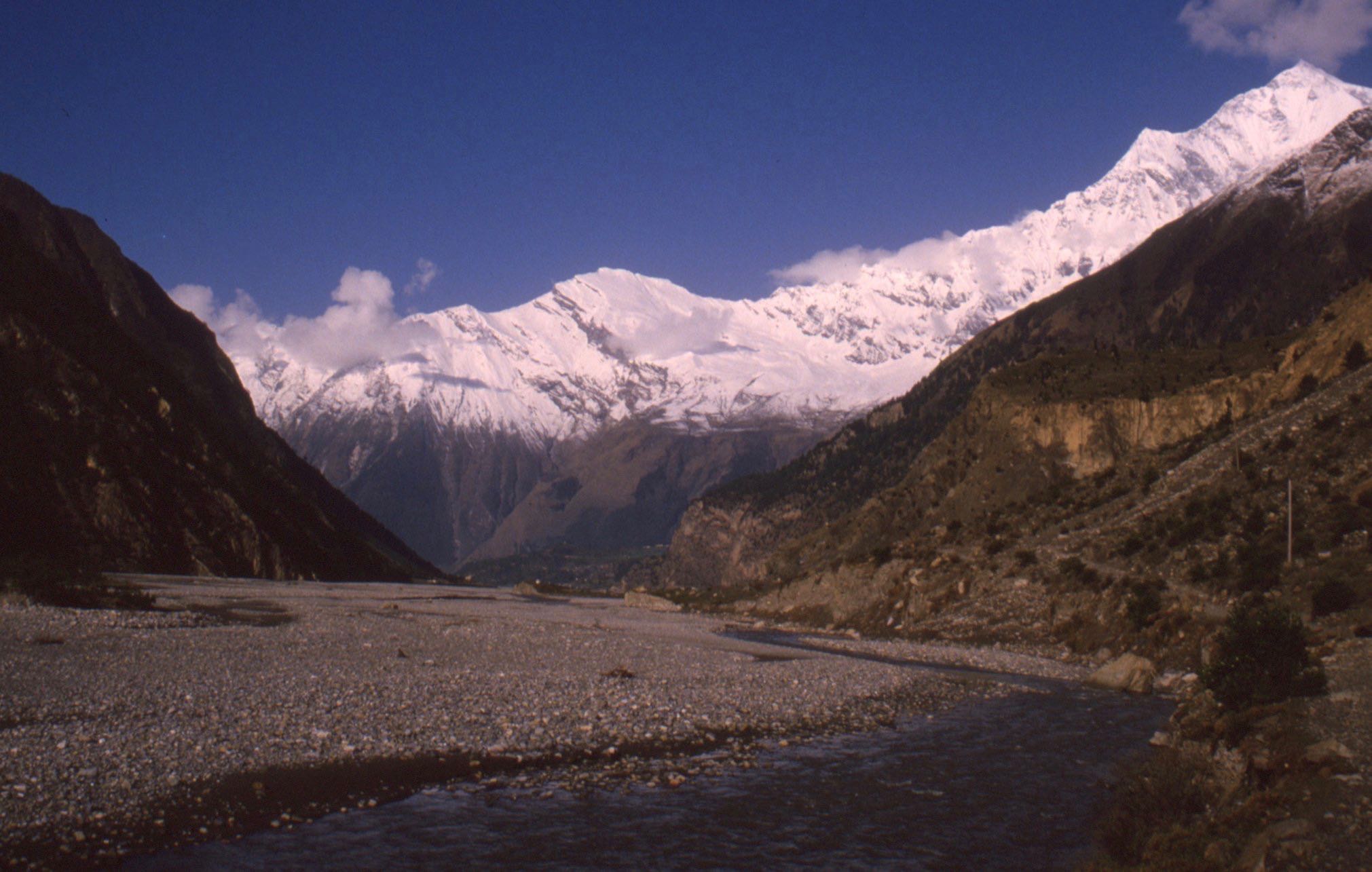 Le surlendemain, j’ai marché de l’aube à la tombée de la nuit, sans doute plus de cinquante kilomètres, avec près de deux mille mètres de dénivelée positive, car il fallait à nouveau franchir un col après avoir atteint le fond de la vallée. Cette dernière avait la réputation d’être la plus profonde au monde, coincée entre les Annapurnas et le Dhaulagiri qui dépassent tous deux les huit mille. Arrivé au lodge, j’y fis la connaissance d’une jeune américaine sourde et muette, avec laquelle je communiquais par petits billets. Elle faisait le Tour en solo.