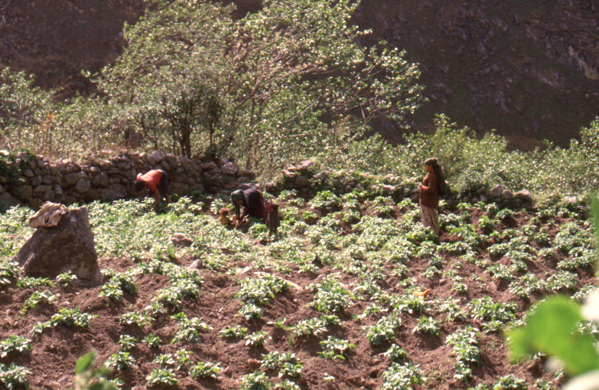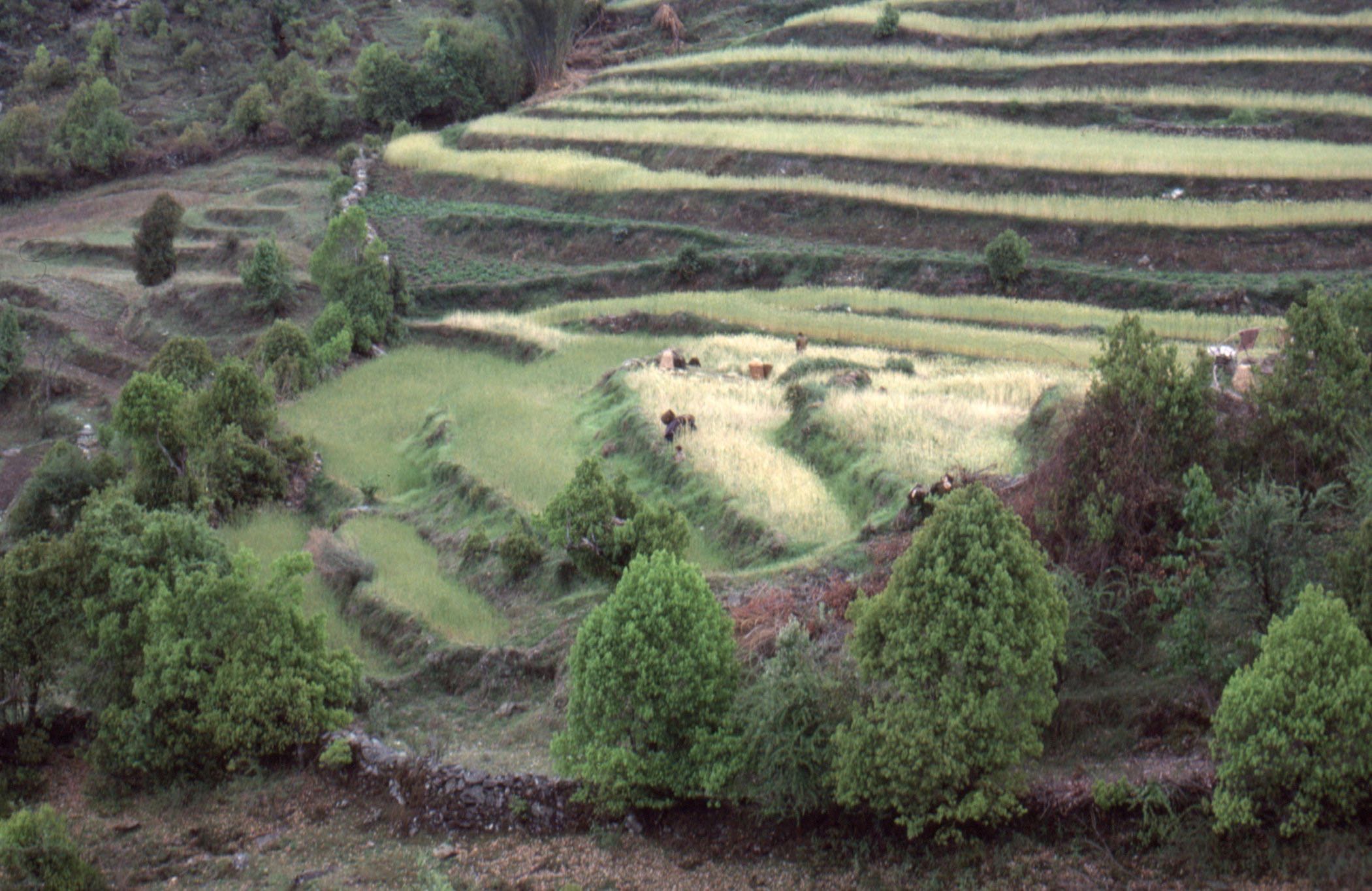 Le départ de la longue boucle de près de trois cent kilomètres était à Besisahar, une bourgade à sept cent soixante mètres d’altitude et quelques heures de bus de Katmandou, sur la route de Pokhara. Ce qui signifiait que pour atteindre le col de Thorong, situé, lui, à cinq mille quatre cent mètres, il fallait grimper près de quatre mille sept cent mètres de dénivelée. Mais la montée n’était pas qu’un franchissement de mètres, elle était aussi une ascension de mondes naturels et humains, de plaines tropicales aux crêtes enneigées, de populations hindouistes aux villages tibétains et bouddhistes. Les animaux et les cultures, eux aussi, changeaient : les gros poulets des vallées étaient encore des œufs couvés en altitude, les plantations de thé se transformaient en parcelles de pommes de terre, puis d’orge. C’était une traversée pédestre des mondes humains et humanisés, une visite verticale des écosystèmes, des saisons et des paysages, de la densité tropicale initiale aux déserts froids d’altitude. La découverte d’un monde silencieux à l’époque, sans bruits de moteurs et de hauts-parleurs, de « musique en boîte ». Quelques voix humaines et cris d’animaux, des frappements de sabots, des odeurs de feux de bois, des bruissements d’eau et de vent, des craquements de bûches brûlées.
