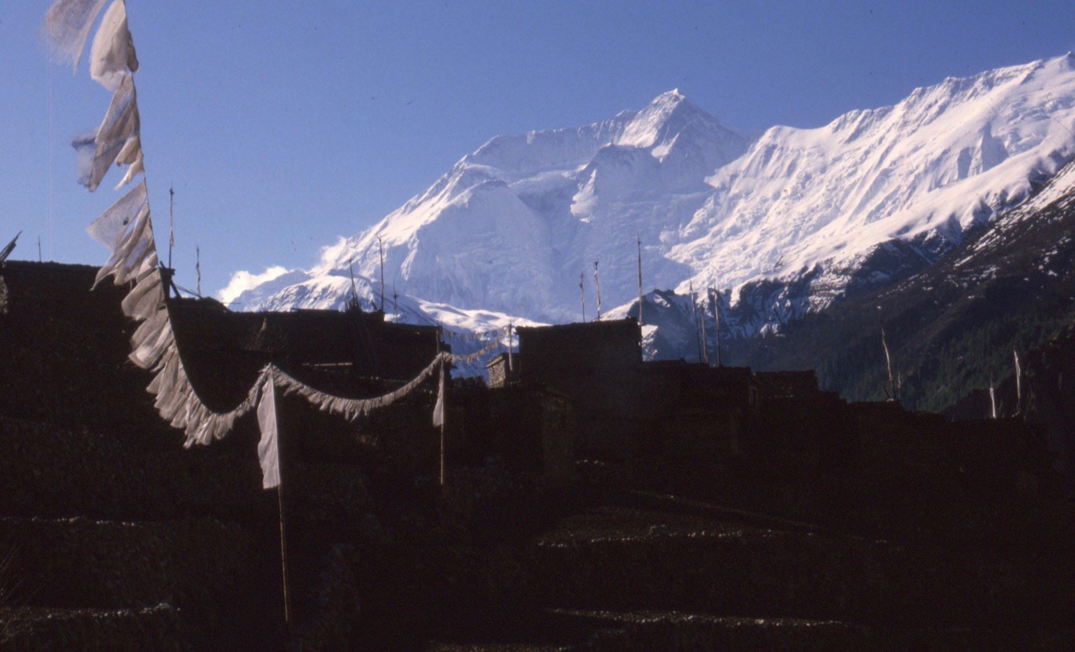 Puis, à l’entrée des villages, apparurent les murs de mani, pierres entassées gravées de mantras, les chortens, l’écriture tibétaine et les svastikas, les maisons blanchies couvertes de branchages, les temples bouddhistes, les yeux bridés et les visages ronds. Un dzo, hybride de vache et de yak, nous fit soudainement face de sa masse trapue. Passé un premier col très ardu, sans doute une ancienne et gigantesque moraine de glacier, nous avons pénétré une large vallée suspendue avec des bouquets de sapins et des torrents. À notre gauche surgit un vaste massif couvert de neige et de glace, pointant ses pics effilés vers le ciel. C’était l’Annapurna, « mère nourricière », et ses différents sommets, ce qui lui vaut le pluriel. Tout était surdimensionné dans ce monde vertical et plissé, sauf les établissements humains qui devenaient de plus en plus petits, repliés au bord de leurs rares terres cultivables. Nous arrivions enfin à Manang, un sombre village où flottaient des drapeaux blancs couverts de textes calligraphiés, montés sur de longues hampes.