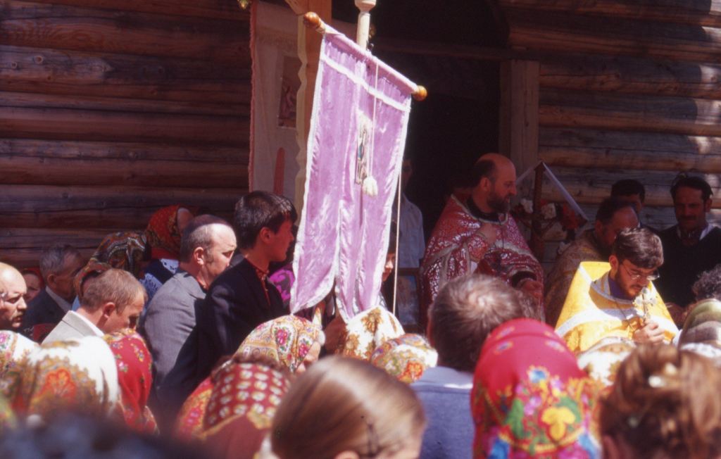 Andreï nous reçoit en costume civil, sans sa soutane fleurie et sa mitre mauve qui lui donne tant de prestance et masque sa calvitie. Il est humble et accueillant, un peu intimidé sans doute. Nous nous asseyons autour d’une table sommaire, au rez-de-chaussée de sa maison trapue, dans une grande pièce recouverte de bois, des murs lambrissés au plancher et au plafond. Des bancs sont alignés au pied des lambris et le centre de la pièce est vide. Une grande armoire vitrée est posée le long d’un mur, une immense affiche représentant un sous-bois de bouleaux en garnit un autre. L’atmosphère est fraîche, humide et forestière.
