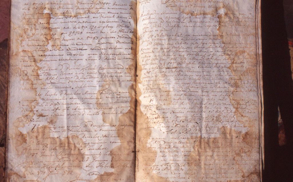 On nous raconte que l’église située au centre du village avait été transformée en salle de gymnastique après la guerre. À l’arrivée des Soviétiques en 1945, le dernier prêtre uniate avait planqué les registres paroissiaux sous les toits, de lourds volumes manuscrits en langues hongroise et ruthène que son beau-fils a récemment sauvé des eaux. Sur de larges pages divisées en colonnes et symétriquement tachetées comme un test de Rorschach, une écriture en belle ronde a enregistré les mouvements de population de Körösmeros (nom hongrois de Iassinia) depuis 1788. Un autre volume fleurant le champignon contient la correspondance en latin avec l’évêque d’Ungvar (Uzhgorod), patiemment recopiée sur du papier épais.