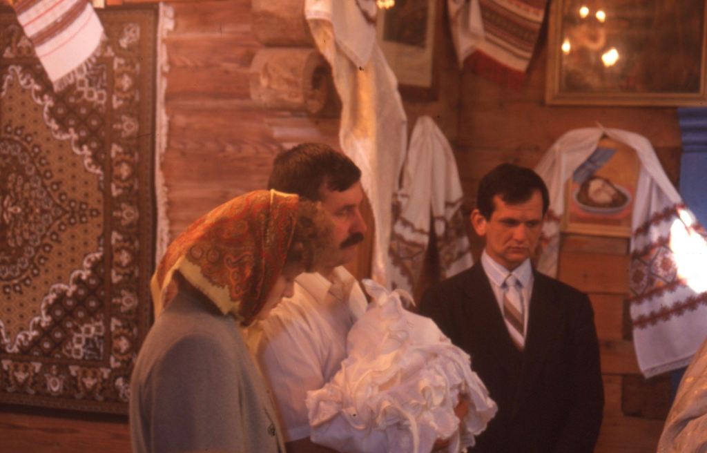 Un peu à l’écart, un « nouvel Ukrainien » de retour dans son village – barbe d’un jour, lunettes fumées, cheveux gominés et souliers brillants – déambule lourdement dans son costume étroit. Il se dirige soudainement vers nous et me fourgue son caméscope dans les mains sans crier gare. Replié au milieu du cercle familial, le businessman s’agenouille humblement dans l’attente du pope et de son eau lustrale.