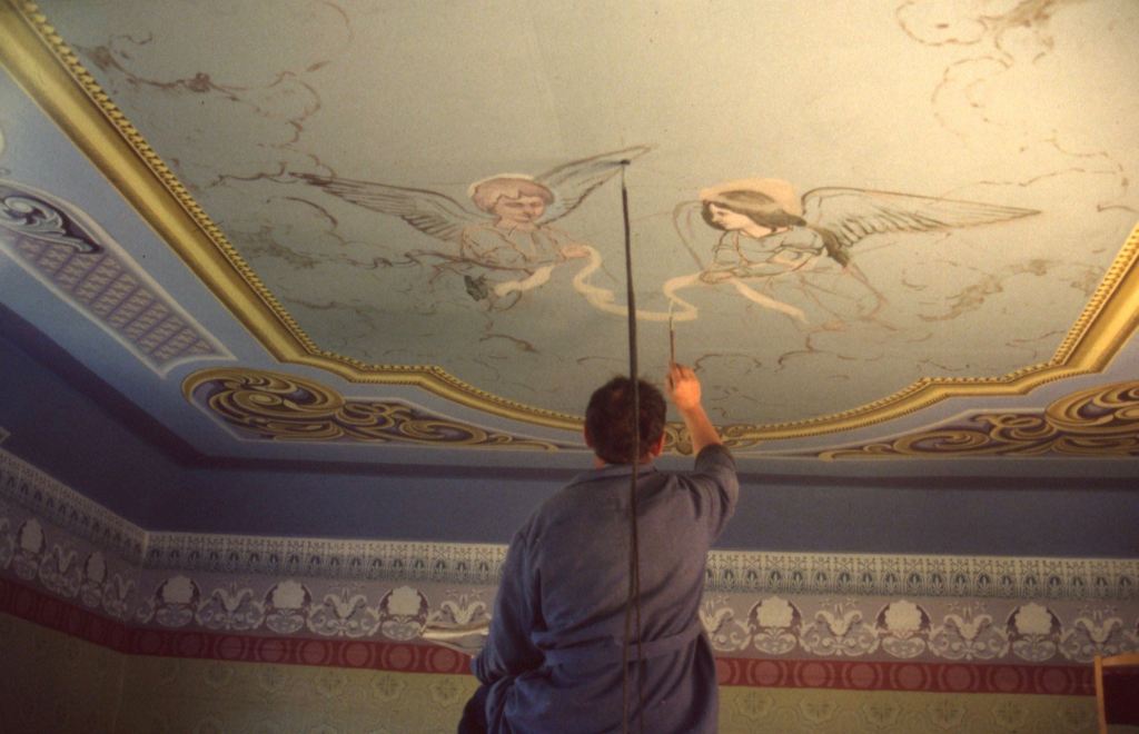 À l’arrière plan de l’estrade, une fresque panoramique donne un avant-goût des temps à venir pour ceux qui survivront à l’Apocalypse. On y voit des montagnes enneigées qui ressemblent au Goverla et au Petros, des forêts de sapin et un grand lac paisible au fond d’une large vallée. En avant-plan, des hommes et des femmes ramassent des pommes grosses comme des pamplemousses, des animaux sauvages descendus des forêts gambadent dans des jardins taillés, une fillette joue avec un ours. Au-dessus de la fresque, cet extrait de l’Épître aux Hébreux: « Nous ne sommes pas de ceux qui font défection… mais de ceux qui croient. »