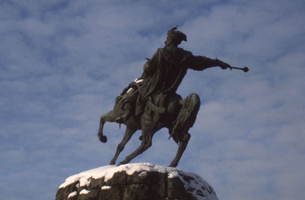 Statue du hetman Bohdan Khmelnytsky au centre de Kyiv, pointant vers Moscou