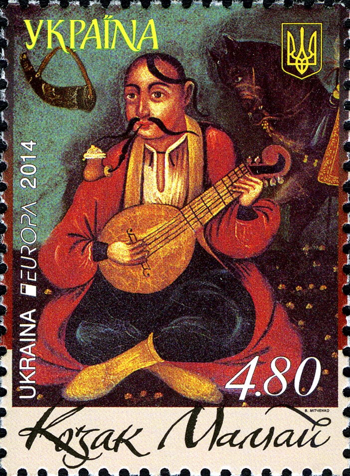Le célèbre Cosaque Mamaï, héros folklorique ukrainien. Le monogramme de l’Ukraine, en haut à droite, symbolise un faucon fondant en piqué sur une proie