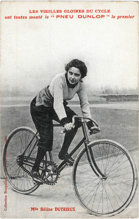 [1] Une femme fit même le “tour du monde” à bicyclette en … 1894-95. Il s’agit de l’Américaine Annie Cohen Kopchovsky (d’origine juive lettonne), surnommée Annie Londonderry du nom de sa marque de vélo. En Belgique, la première championne cycliste est Hélène Dutrieu (1877-1961), surnommée “la flèche humaine” après son titre officieux de championne du monde vitesse à Ostende en 1897 et 1898. Elle deviendra la première aviatrice belge et sera aussi cascadeuse.