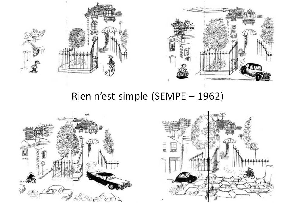 Mais ensuite, comme dans un fameux dessin de Sempé de 1962 dans Rien n’est simple (j’ai constaté qu’il était repris à fin du livre de Frédéric Héran, 2015), la situation a progressivement changé. Le bobo urbain sort de sa maison à vélo, le prolo est coincé dans les embouteillages en bagnole (j’en connais). Bien évidemment, ce n’est pas aussi simple, mais c’est une belle caricature qui illustre une part de vérité. Mon sujet n’est pas tant de raconter cette histoire, que je vais néanmoins synthétiser, que de prendre la mesure de la « révolution culturelle » qui accompagne cette seconde vélorution urbaine – déjà largement entamée dans le Nord de l’Europe. Ce n’est en effet pas seulement un changement technique en termes de locomotion, mais un tournant dans nos modes de vie et de sociabilité quotidienne, associé à d’autres mutations associées (circuits courts, végétalisation urbaine, zones 30 km/h, produits alimentaires en vrac, recyclages, robustesse au lieu de performance, coopération, etc.).