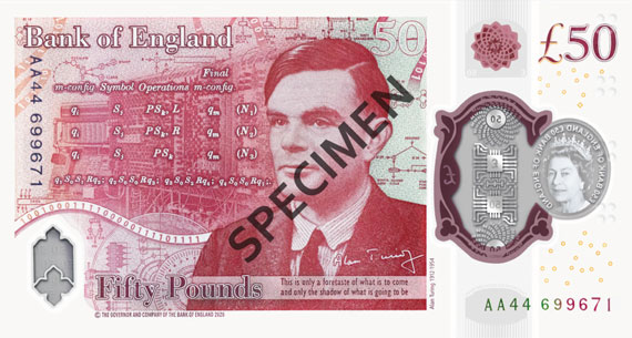 P.S. La thèse d’un assassinat par les services secrets britanniques, dans le contexte de la Guerre froide et de l’affaire des « Cinq de Cambridge », espions pour l’URSS mais aussi homosexuels et sensibles au chantage, me semble peu crédible. L’espionnage des Cinq fut démasqué en 1951 par le biais d’une opération de décryptage (encore) des messages soviétiques, le projet Verona. Même si Turing était sous surveillance des services, j’ai du mal à imaginer que ces derniers aient été au courant de sa fascination pour Blanche-Neige et pensé à tremper une pomme dans du cyanure… Il eût été plus simple de provoquer un accident de la circulation. De plus, les services secrets connaissaient – et pour cause – le travail effectué par Turing à Bletchley Park, qui avait sauvé l’Angleterre. Le visage de Turing figure aujourd’hui sur les billets de 50 livres, au verso de celui de la Reine (je ne suis pas certain que cela lui aurait plu) … puis du Roi.